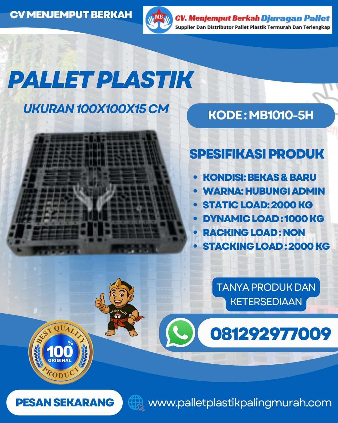 CV Menjemput Berkah kembali menghadirkan solusi terbaik untuk kebutuhan logistik dan penyimpanan Anda melalui produk Pallet Plastik Baru & Bekas 100x100x15 [MB1010-5H]. Sebagai perusahaan yang berpengalaman dalam penyediaan pallet plastik berkualitas dengan harga terjangkau, kami memahami betapa pentingnya penggunaan pallet yang kuat, higienis, dan tahan lama untuk mendukung kelancaran operasional bisnis Anda. Produk ini dirancang khusus untuk memenuhi kebutuhan industri modern yang menuntut efisiensi, keamanan, serta standar internasional dalam proses distribusi maupun penyimpanan barang.