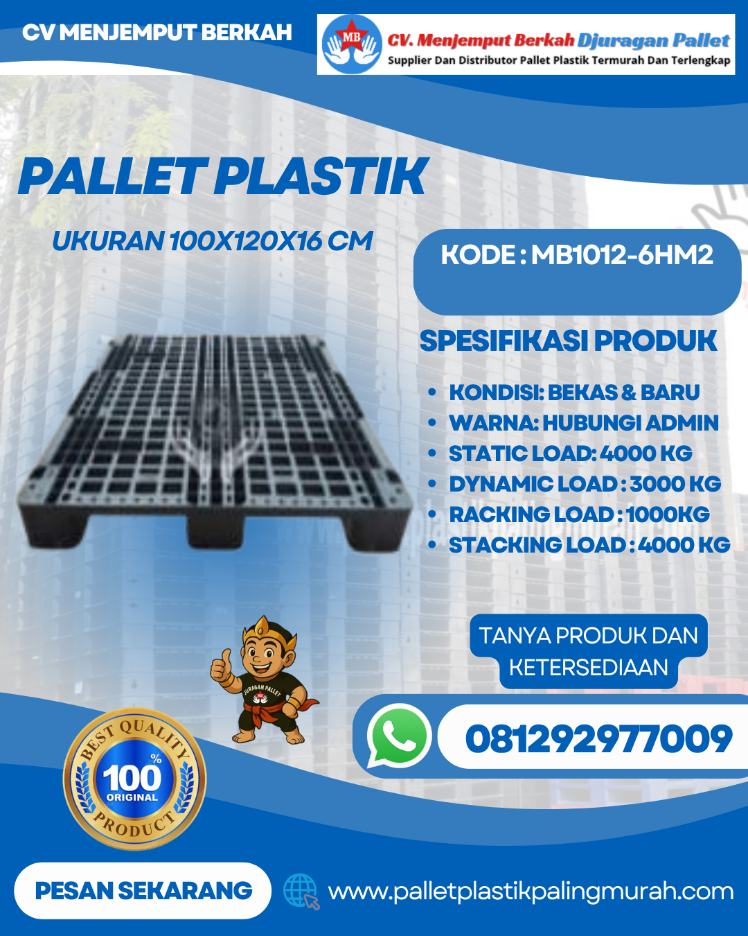 Sebagai mitra terpercaya, CV Menjemput Berkah menawarkan Pallet Plastik MB1012-6HM2 dengan berbagai keunggulan, mulai dari harga yang kompetitif, kualitas pallet yang kuat dan tahan banting, stok siap kirim, hingga layanan pengiriman ke seluruh wilayah Indonesia. Pallet plastik ini juga terhindar dari pertumbuhan bakteri, menjadikannya solusi yang lebih higienis dan aman untuk penggunaan jangka panjang.