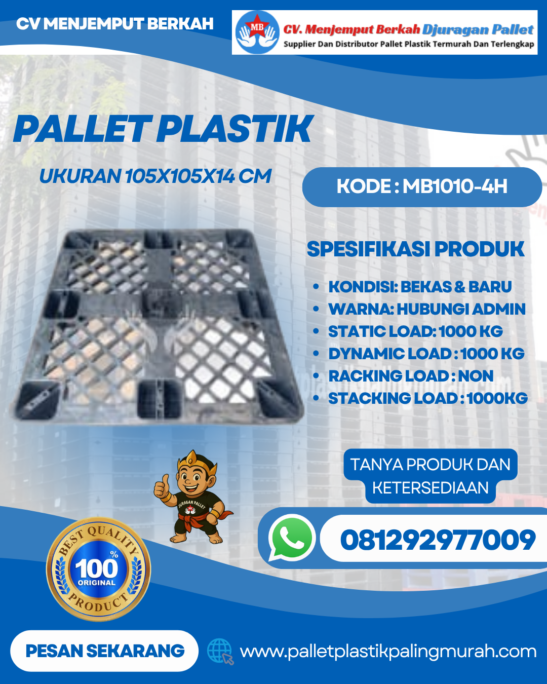 Pallet Plastik Baru & Bekas 105x105x14 [MB1010-4H] merupakan pilihan tepat bagi perusahaan yang membutuhkan solusi penanganan dan penyimpanan barang yang praktis, higienis, serta efisien. Produk ini dipasarkan oleh CV Menjemput Berkah, perusahaan yang berfokus pada penjualan pallet plastik baru maupun bekas dengan kualitas terjaga, pelayanan yang responsif, serta harga yang kompetitif untuk berbagai kebutuhan industri dan logistik di Indonesia.