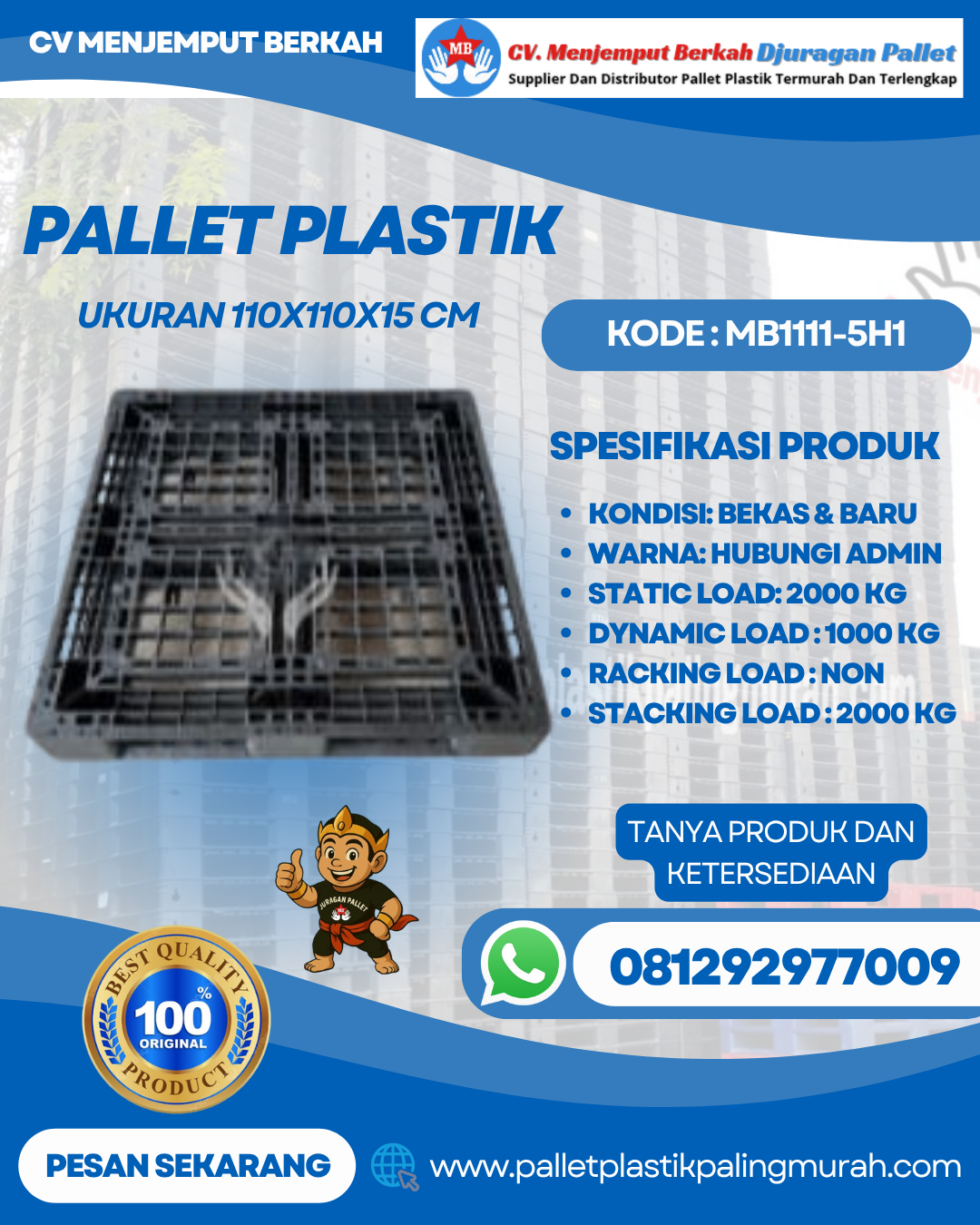 Untuk informasi harga dan pemesanan, silakan hubungi tim sales CV Menjemput Berkah melalui WhatsApp 0812-9297-7009 atau email sales@palletplastikpalingmurah.com