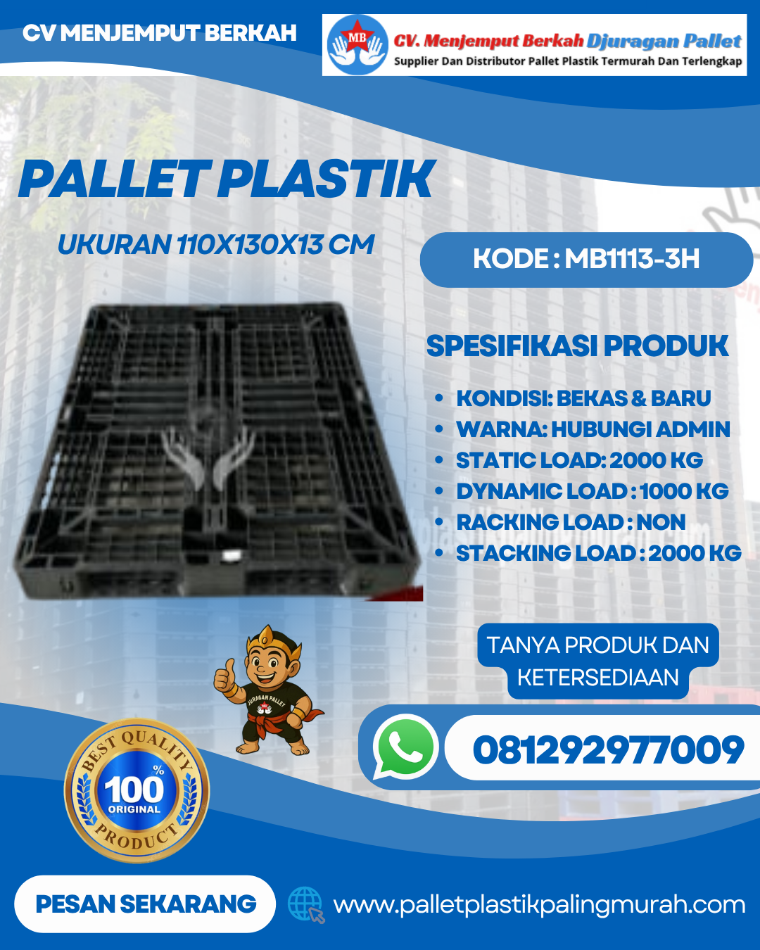 Dalam kegiatan logistik, pergudangan, dan distribusi barang, pemilihan pallet yang tepat menjadi faktor penting untuk menjaga efisiensi kerja serta keamanan produk. Pallet yang kokoh, mudah ditangani, dan tahan lama akan membantu memperlancar proses penyimpanan maupun pengiriman. CV Menjemput Berkah, sebagai perusahaan yang bergerak di bidang penjualan pallet plastik baru dan bekas, berkomitmen menyediakan produk berkualitas dengan pelayanan profesional dan harga yang terjangkau. Salah satu produk unggulan yang banyak digunakan oleh berbagai sektor industri adalah Pallet Plastik Baru & Bekas 110x130x13 [MB1113-3H].