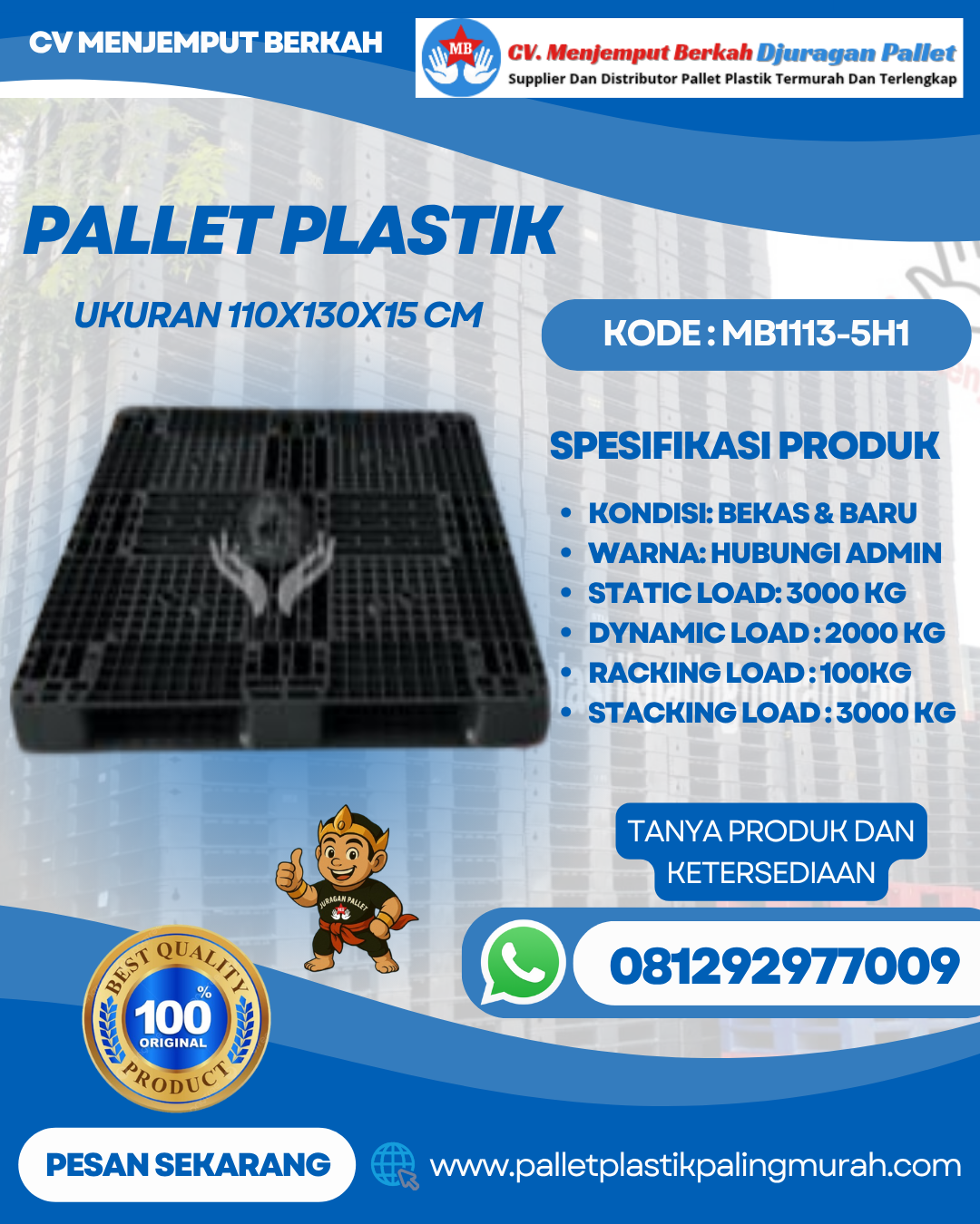 Dalam dunia industri, logistik, dan pergudangan, penggunaan pallet yang kuat dan andal menjadi faktor penting untuk menjaga kelancaran operasional. Pallet tidak hanya berfungsi sebagai alas penyimpanan, tetapi juga sebagai penunjang efisiensi dalam proses pemindahan dan distribusi barang. CV Menjemput Berkah, sebagai perusahaan yang bergerak di bidang penjualan pallet plastik baru dan bekas, menghadirkan solusi pallet plastik berkualitas dengan harga yang terjangkau dan pelayanan profesional. Salah satu produk unggulan kami adalah Pallet Plastik Baru & Bekas 110x130x15 [MB1113-5H1].