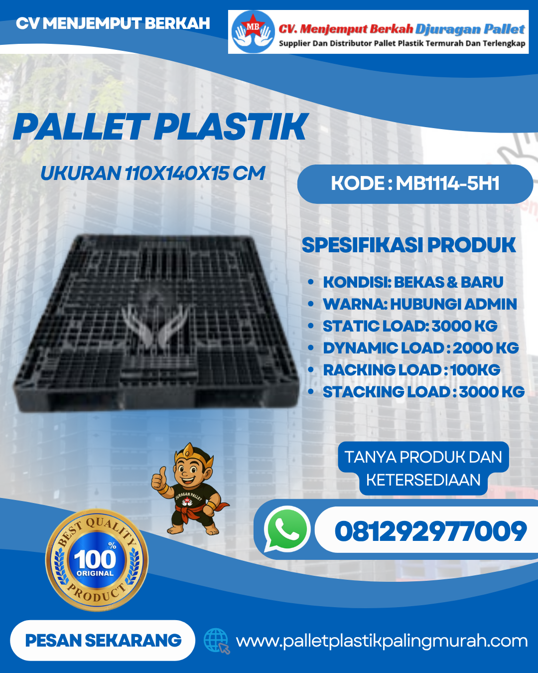 . CV Menjemput Berkah siap melayani pengiriman ke seluruh wilayah Indonesia dengan proses cepat dan aman. Pilih Pallet Plastik MB1114-5H1 sebagai solusi pallet berkualitas, kuat, dan ekonomis untuk bisnis Anda.